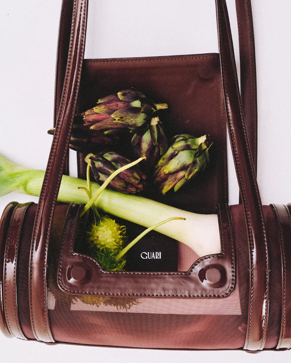 um barrilzinho para adicionar ao seu closet! <3 nossa bolsa eda, em formato barrel, é feita cuidadosamente em telinha transparente com vinil. descolada e super cool é uma opção que promete te acompanhar do escritório ao happy hour!